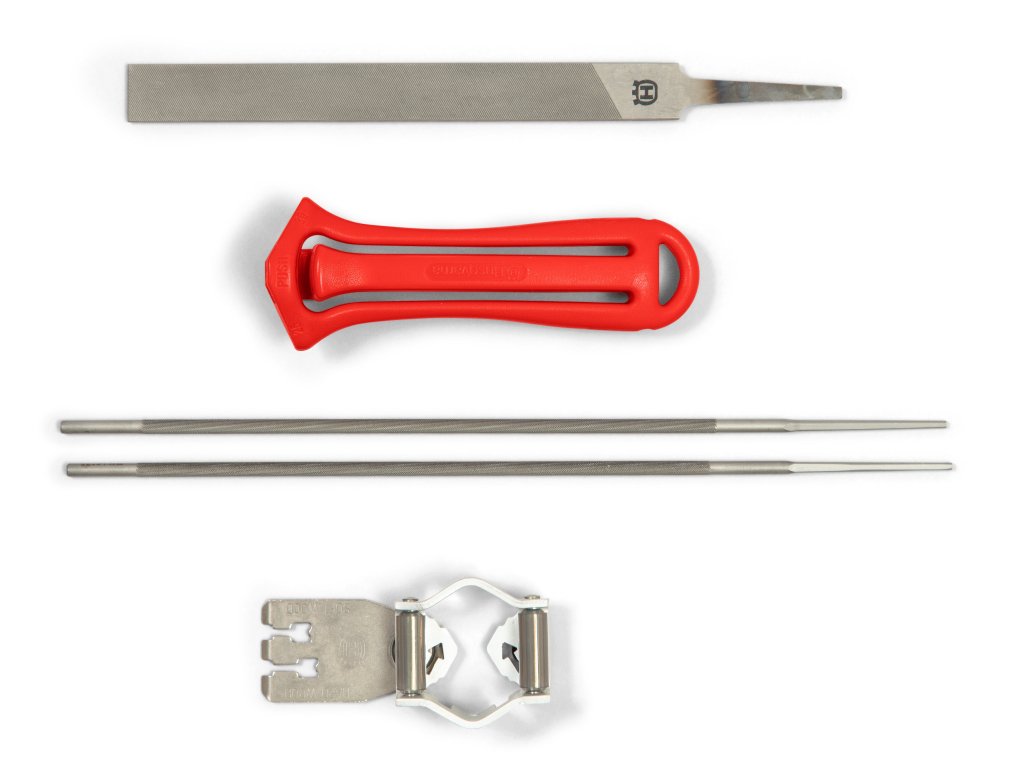 Kompletní sada na ostření řetězů pro snadné udržování stále nabroušeného řetězu. Se správně nabroušeným řetězem bude vaše práce snadnější a bezpečnější. Sada obsahuje rukojeť pilníku, kombinované vodítko nebo vodítko pro ostření a měrku pro snížení omezovacího zubu, dva kulaté pilníky a jeden plochý pilník.